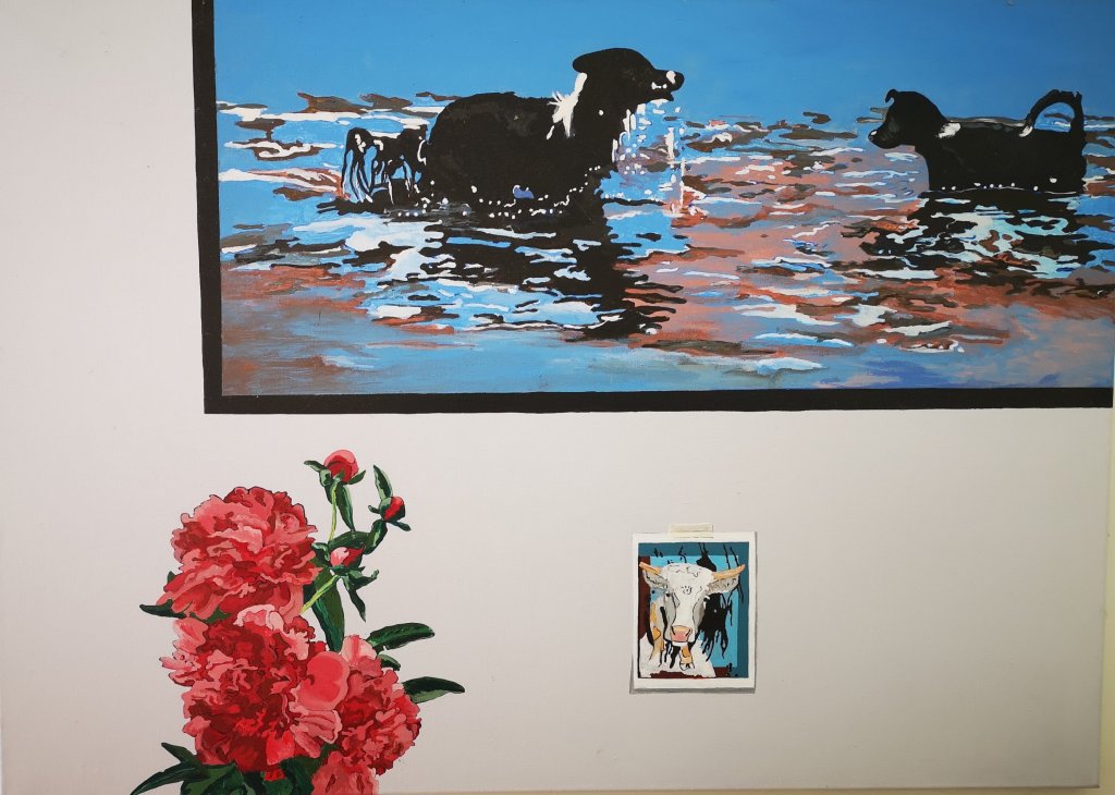 Het schilderij van de maand mei staat voor mij in het teken van ‘verlangen’ . Verlangen naar zorgeloosheid, naar niet afgeleid worden, rust, ruimte. Buiten het raam of kader met de twee spelende honden in het water, is de achtergrond bewust glad en strak gehouden. Geen beweging. Verstilling. Op het behang zit een kaart geplakt. Een kaart die verwijst naar mooie herinneringen. De pioenroos is afgebeeld zonder vaasje.