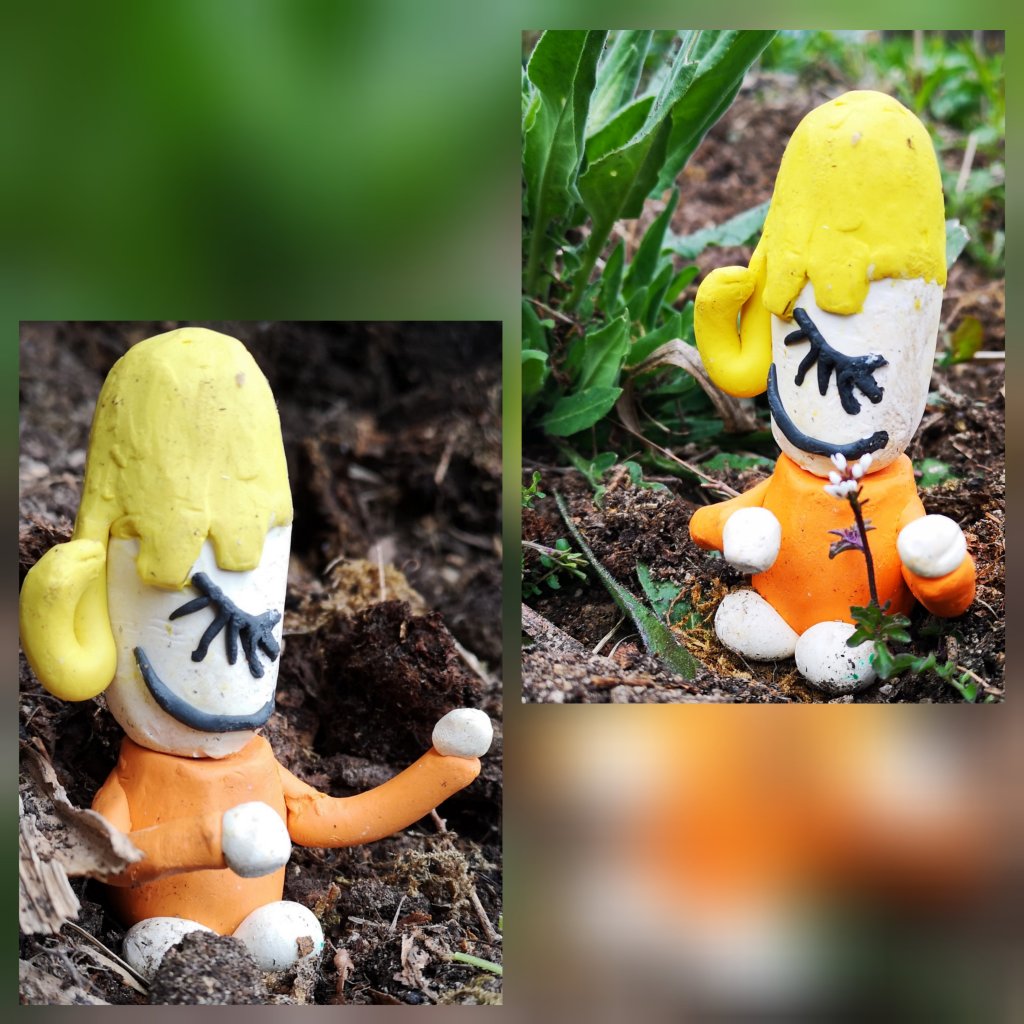 Het blijkt super goede aarde te zijn, compost, afkomstig van tuinafval, schillen van onbespoten fruit, restanten van groente, eierschalen en gehakseld hout. Hoe ik dat allemaal weet? Ik belandde na de ‘mesthoop’ in de bloementuin waar de kunstenaar bezig was met de grond van de zelf gekweekte compost te voorzien. Daar vertelde ze mij dit interessante verhaal. Een kring-loopje. Weer eens wat anders dan jouw eeuwige haas-op-de-loop.