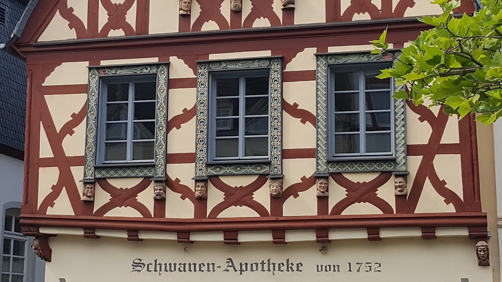 We halen heerlijke Italiaaanse ijsjes en nestelen ons op een beschaduwde plek op de markt met mooi uitzicht op twee schitterende vakwerkhuizen uit de 17 en 18 eeuw met een duidelijke barokke tekening. In het ene huis, het Rathaus met zeshoekige gevel, is de VVV van de Hunsruck gevestigd en in het andere de Zwanenapotheek. Bij de VVV halen we een stapel folders. Ik lees daarin dat Kirchberg al in 1295 stad-en marktrechten kreeg en daarmee ook nog eens de oudste stad van de Hunsruck is.