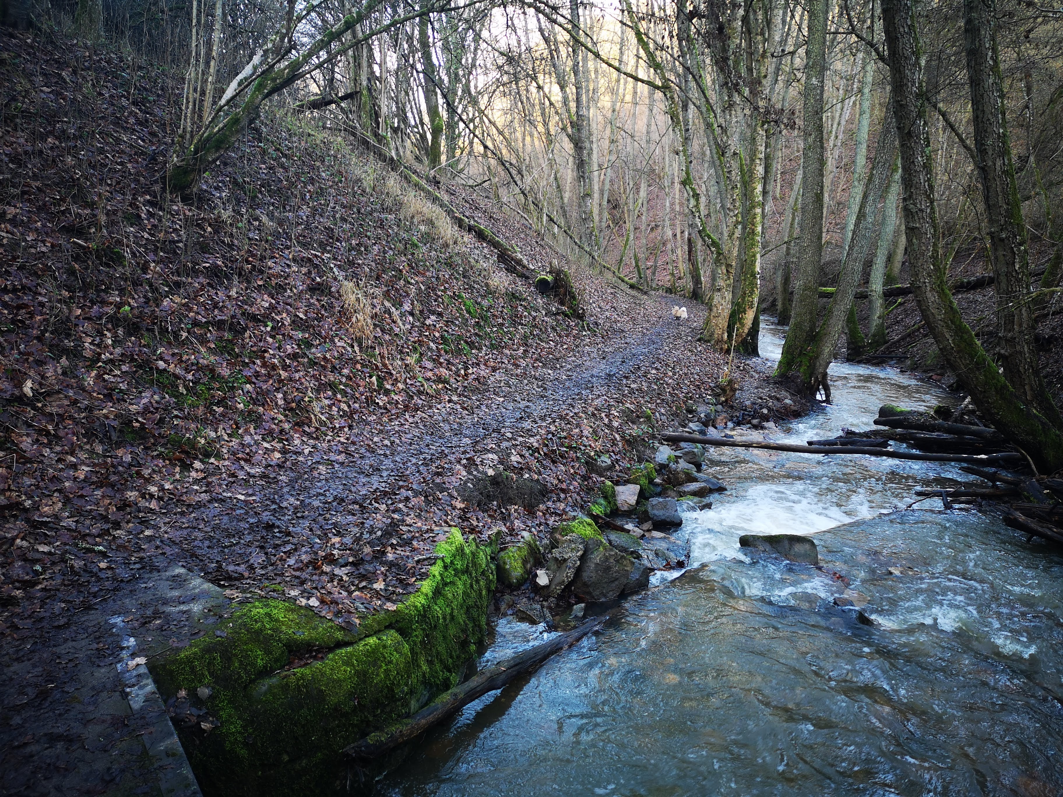 Vanaf de parkeerplaats bij de burcht volg je een smal pad door het idyllische Trübenbachtal dat langs de woest stromende beek door een rustiek bos naar een kleine waterval voert. Veel verder dan de eerste brug over de beek kwam ik die middag niet want deze had als gevolg van de vele regen- en sneeuwval van de laatste dagen het pad volledig overstroomd.