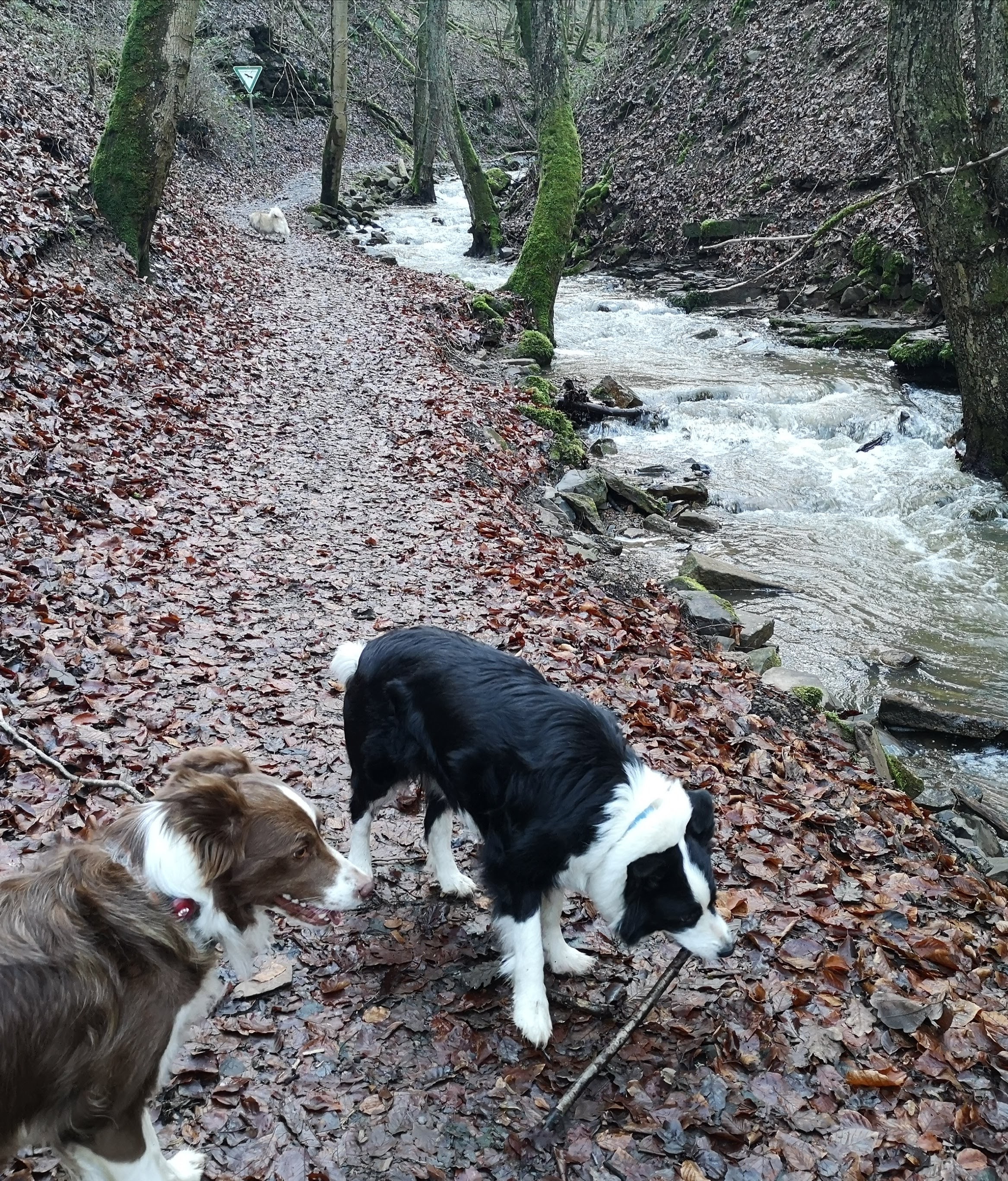 Nadat ik haar op haar bestemming had achtergelaten reed ik met de honden over een steil kronkelende weg naar een van de hoogste punten van de stad, waar de ruïnes van de oude middeleeuwse burcht ‘De Kyrburg’ liggen. Vandaar heb je een prachtig uitzicht over het Nahe-dal, de ‘Kirner Dolomieten’ , de stad en de zuidelijke uitlopers van de Hunsruck.