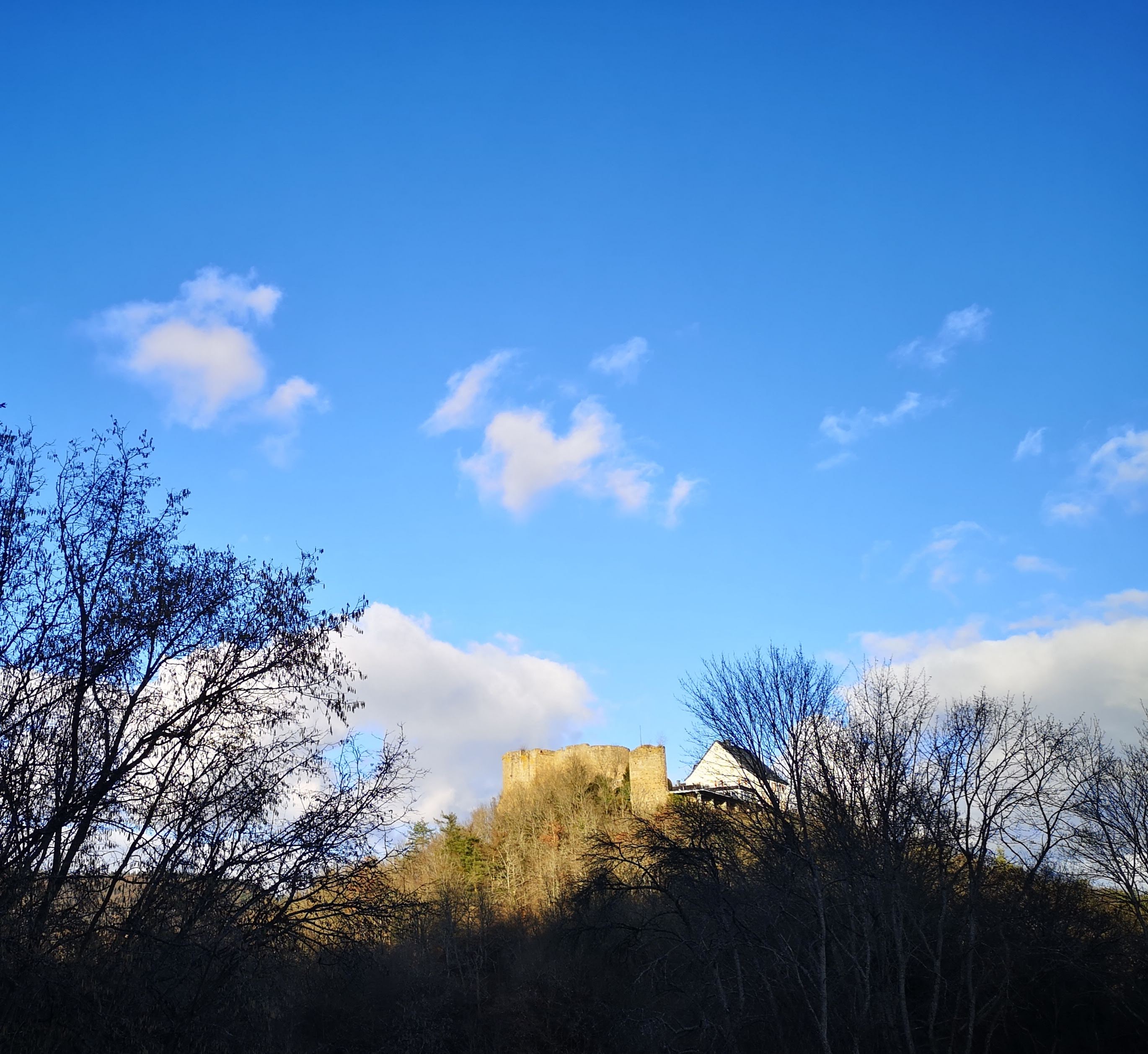 Het was schitterend weer. Je kent dat wel : zo’n ijsblauwe zonnige dag, waarvan je hoopt dat er nog vele zullen volgen. Echt wandelweer. En aangezien ik wel wat tijd had startte ik met de ‘Drie-kastelen-route’ , een meermaals bekroonde rondweg van 13, 5 kilometer rondom Kirn. Wil je de route helemaal lopen dan mag je daar wel een dag voor uittrekken, maar je kan hem ook in delen lopen door elke keer een ander beginpunt van de wandeling te kiezen.