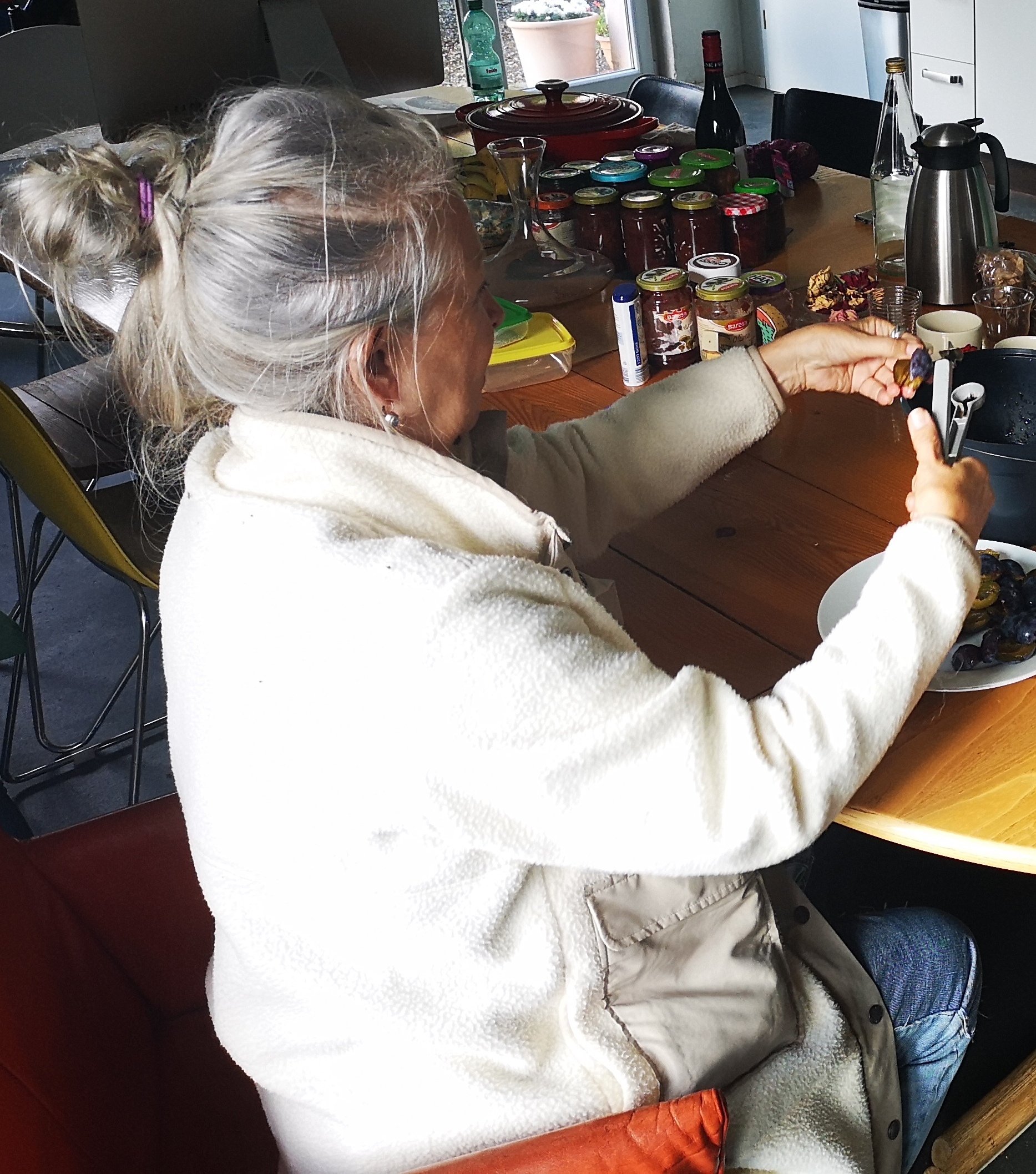 De pruimenboom was al zo goed als leeggeplukt door ons en de twee bordercollies Lucy en Romy (die dol zijn op pruimen).
