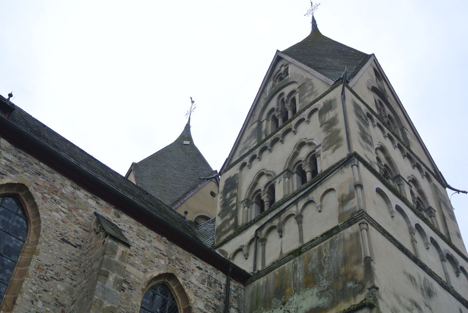 In de kerk vind je een mengelmoes van Romantische, Barokke, Gotische en Moderne bouwstijlen. We genieten van een moderne kruiswegstatie, het barokke altaar, het prachtige orgel en de heerlijke galm die tot buiten te horen is. De oorspronkelijke kerk moet een driearmige baseliek geweest zijn in Romaanse stijl. De indrukwekkende spitsen zijn daar nog een voorbeeld van. Mij doen de leistenen kappen aan nonnenkappen denken. Vanwege de tweelingtorens noemen de Hunsruckers de kerk liefdevol ‘de Dom’.