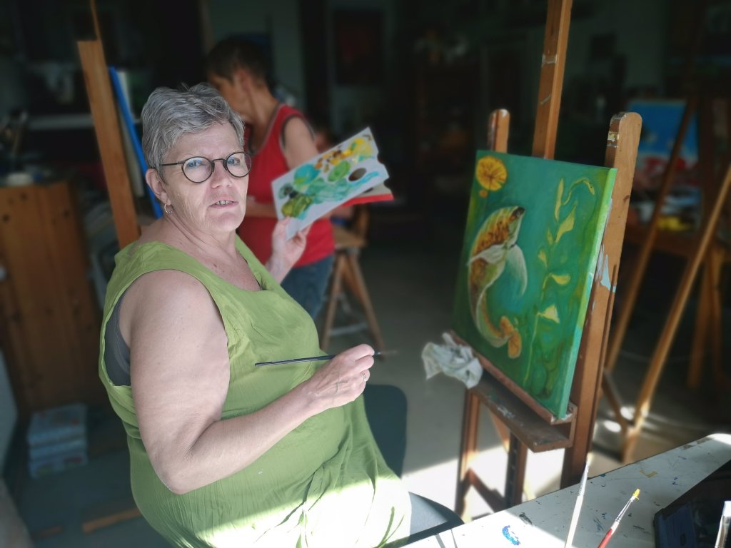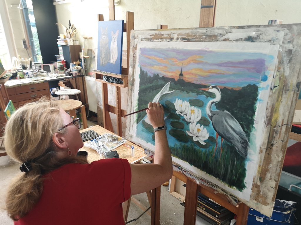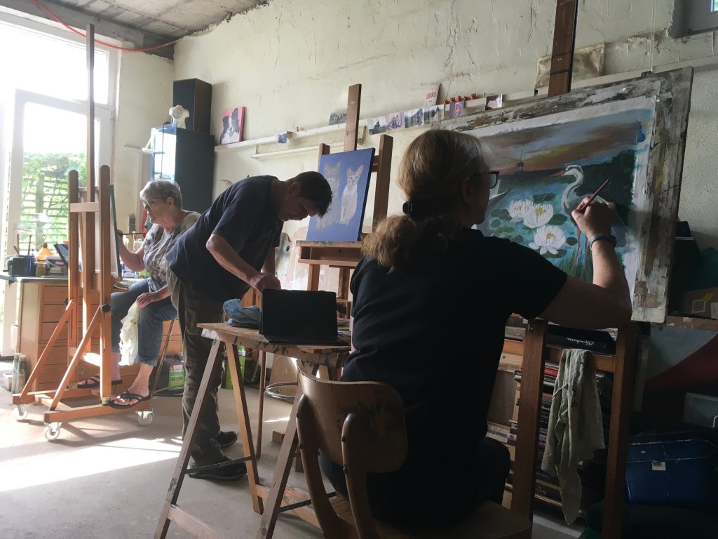 Sandra had verwacht meerdere schilderijen in een week te kunnen maken. Als beginner had ze zich niet gerealiseerd dat het best veel tijd kost om een goed schilderij op te zetten. Dat is een van de vele dingen die ze geleerd heeft zo vertelt ze na afloop. Haar mede-cursist Jolanda, die ook nog niet veel ervaring had, ontdekte dat ze wat schilderen betreft meer geduld heeft dan ze ooit van zichzelf gedacht had. ‘Ik vind het heerlijk om een schilderij laagje voor laagje op te bouwen. Voor mij voelt het als een meditatie. Ik word er zen van. Kleuren mengen, lekker roeren en zo mijn hoofd leeg maken’.Jolanda vond het ook heerlijk om samen te schilderen. ‘Een overzichtelijk aantal van zes mensen.