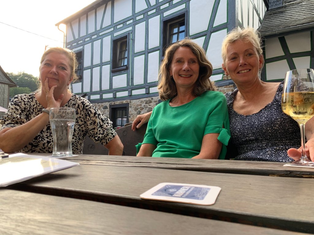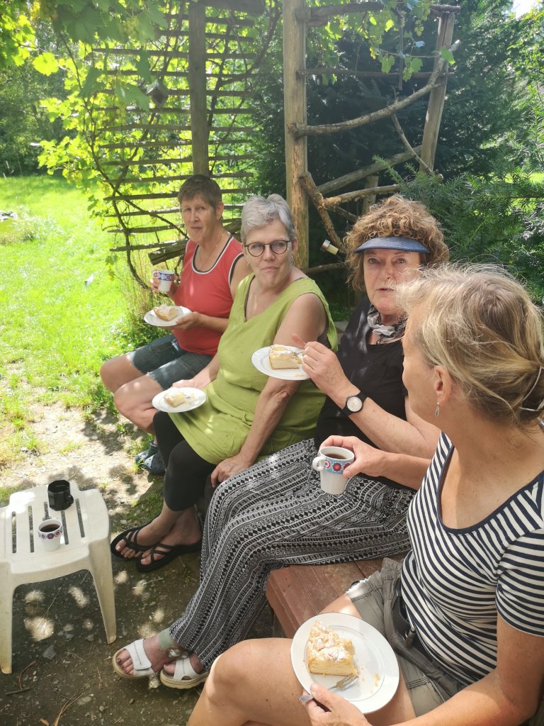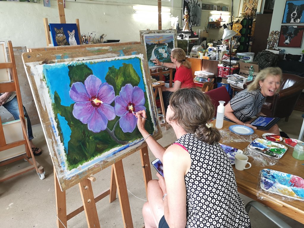 Al struinend door de tuin valt Sandra’s oog op de hibiscus. Dat wordt haar onderwerp en Jolanda gaat voor de korenbloemen en klaprozen al, zo zegt ze later ‘hadden we die zelf niet op de boerderij’. Maar ze vertegenwoordigen toch mijn heimat-gevoel dat voor ‘het buitenleven’ staat.