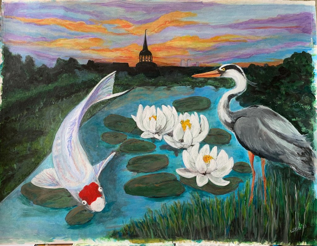 Willie: ‘ Samen met Conny ben ik gaan brainstormen en toen kwam ik tot de conclusie dat het bepaalde elementen zijn die bij elkaar mijn heimat-gevoel geven. Het uitzicht vanaf mijn balkon, de binnentuin, de koikarpers in de vijver en de reiger die er altijd staat, loerend naar die lekkere hapjes. ‘