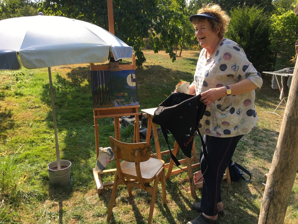 ‘Ik vind het heerlijk om een schilderij laagje voor laagje op te bouwen. Voor mij voelt het als een meditatie. Ik word er zen van. Kleuren mengen, lekker roeren en zo mijn hoofd leeg maken”, aldus Jolanda na een week zomerschilderen. “En ook het samen schilderen is heerlijk. Het aantal van zes deelnemers is overzichtelijk. Samen stil zijn, soms wat zeggen, je kijkt naar elkaars werk, je leert van elkaar. Zo bijzonder.”