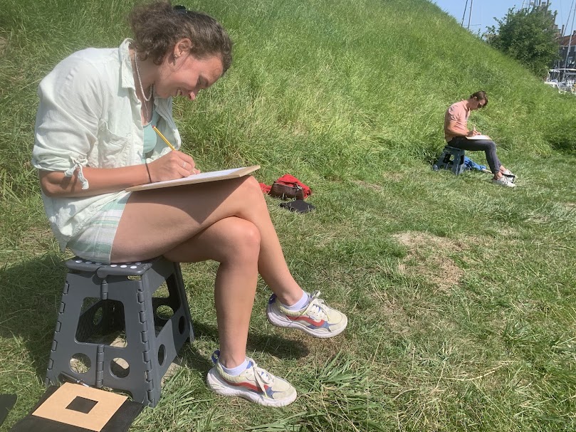 Met zicht op de prachtige 16de eeuwse herenhuizen van het eens zo rijke Veere hebben de úrban sketchers zich onderaan het bastion aan de overkant van de Kaai geïnstalleerd op de meegenomen tekenkrukken.