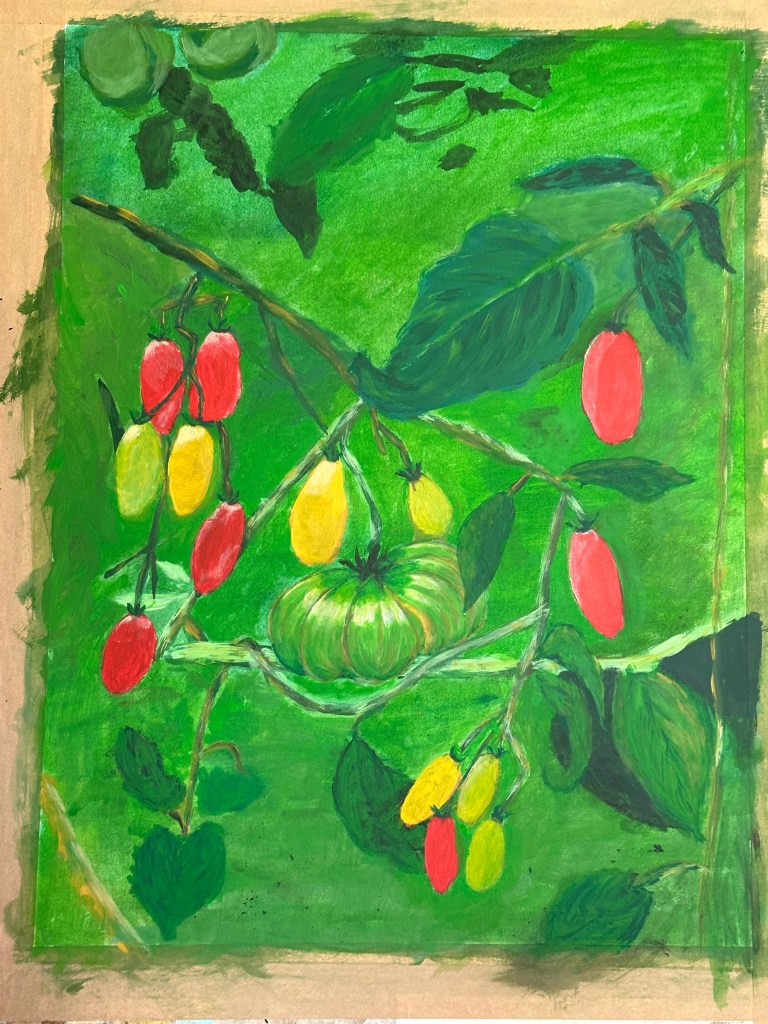 Margreet heeft net als Trudy en Meta twee schilderijen afgemaakt. ‘Het eerste schilderij heb ik me wel aan het thema ‘Eten en drinken’ gehouden, het tweede schilderij werd iets heel anders. Ik had in eerste instantie bedacht om een collage te maken van alle indrukken die ik tot dan toe had opgedaan. Maar dat werd niets. Normaal gesproken knip ik de stukken eruit waar ik niet tevreden over ben. Maar Conny liet mij het meeste gewoon wegschilderen. Toen moest ik het schilderij omkeren en heb ik herfstige distels over de rest heen geschilderd. Het resultaat is verrassend mooi geworden vind ik zelf!