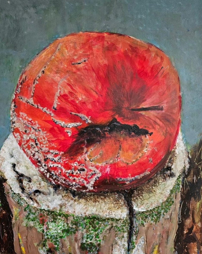 Van tevoren had ze nagedacht over het thema ‘Eten en drinken’ van de najaar-schilderweek. Maar eenmaal in Bollenbach liet ze die gedachten los en ging aan de slag met rotte appels.
