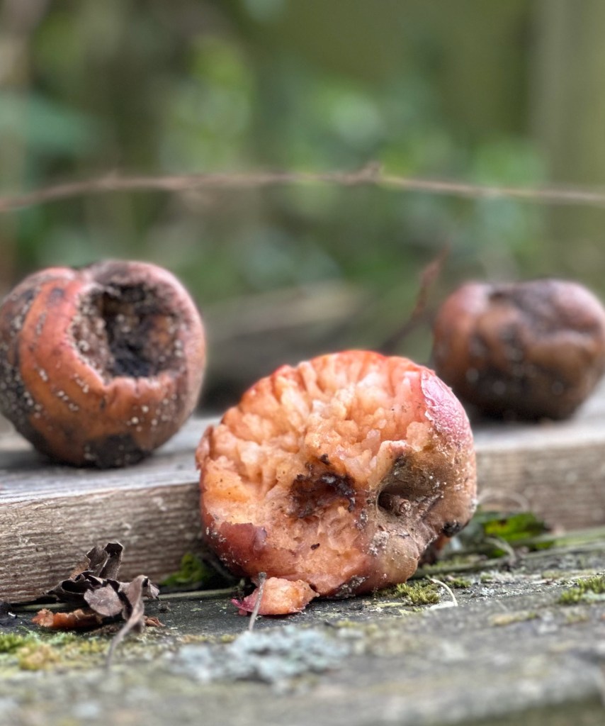 Meta: ‘Dat is tenslotte ook eten. Voor de vogeltjes, de insecten, de schimmels. Zo’n verhaal heb ik dan in mijn hoofd als ik aan het schilderen ben. En ik hou gewoon van de schoonheid van vergankelijkheid’.