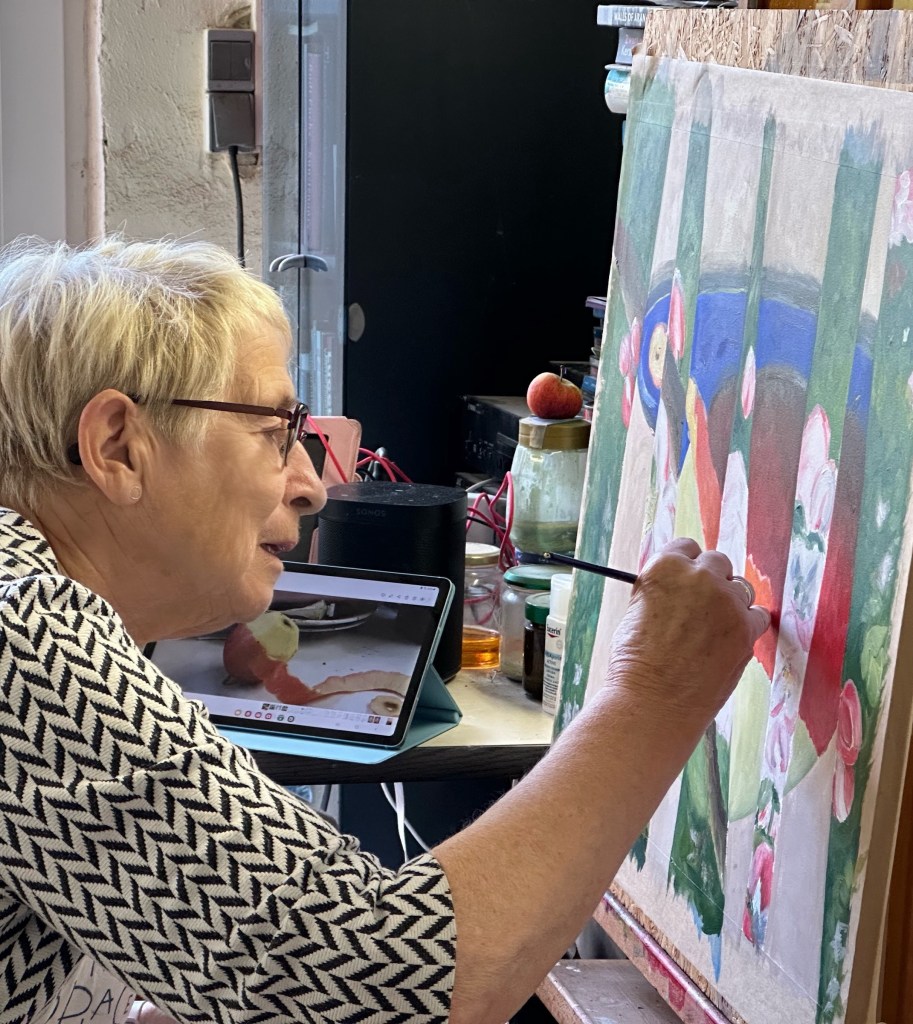 Trudy beaamt dat het haar heel leuk leek om samen met haar dochter iets te doen. ‘Al nadenkend kwam ik al snel uit bij Conny in Bollenbach. Ik ben nog niet zo lang geleden verhuisd en in mijn nieuwe huis heb ik een schilderkamertje ingericht. Ik hoopte dat het heilig vuur zo weer zou gaan branden, maar daar had ik blijkbaar Conny voor nodig. Ik vond het verrassend leuk om in een groep te schilderen. Dat had ik nog niet eerder zo gedaan. En ik heb mezelf voorgenomen gewoon weer te beginnen met schilderen. Elke maandagmiddag met app-of skypecontact met Conny als ik dat nodig heb.”