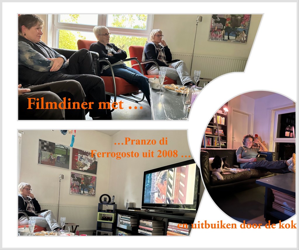 Op de vrije woensdagavond kregen de cursisten een film-etentje aangeboden. Voor wie dat leuk vond, werd de film “Pranzo di Ferrogosto van Gianni di Gregorio” vertoond. De deelnemers konden tussendoor genieten van een menu gebaseerd op de gerechten uit de film. Geheel in stijl met het thema van de week “Eten en drinken”.