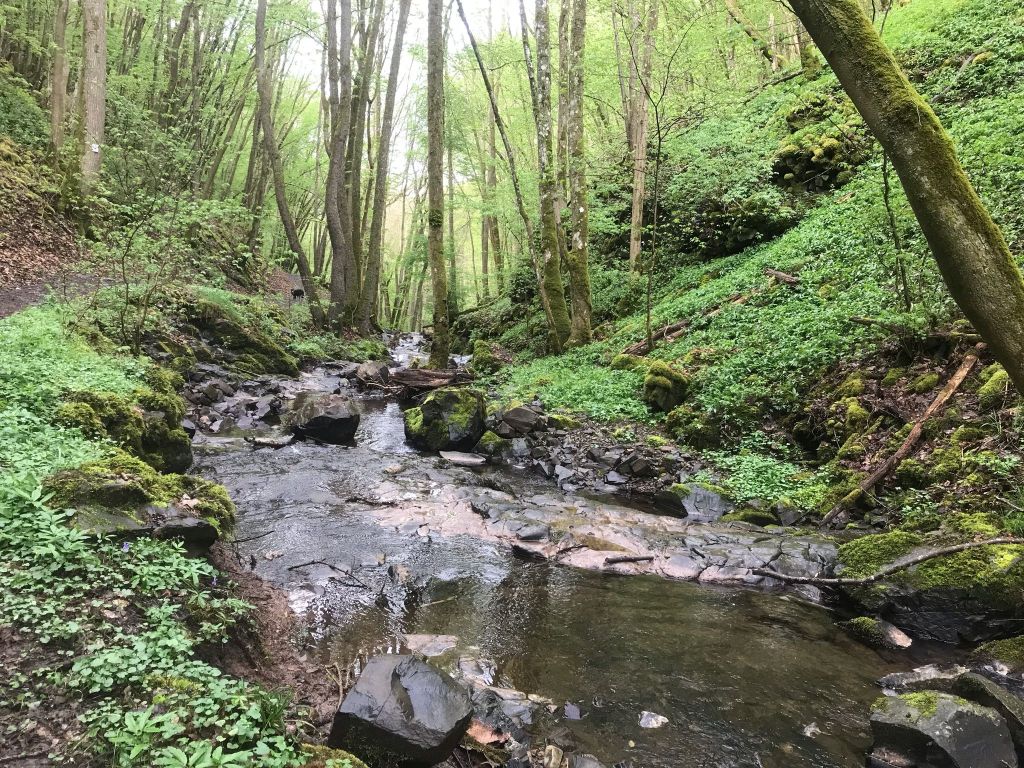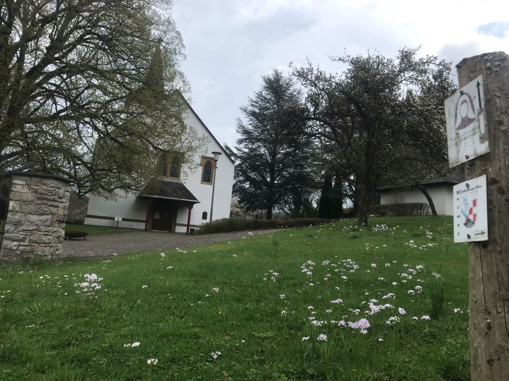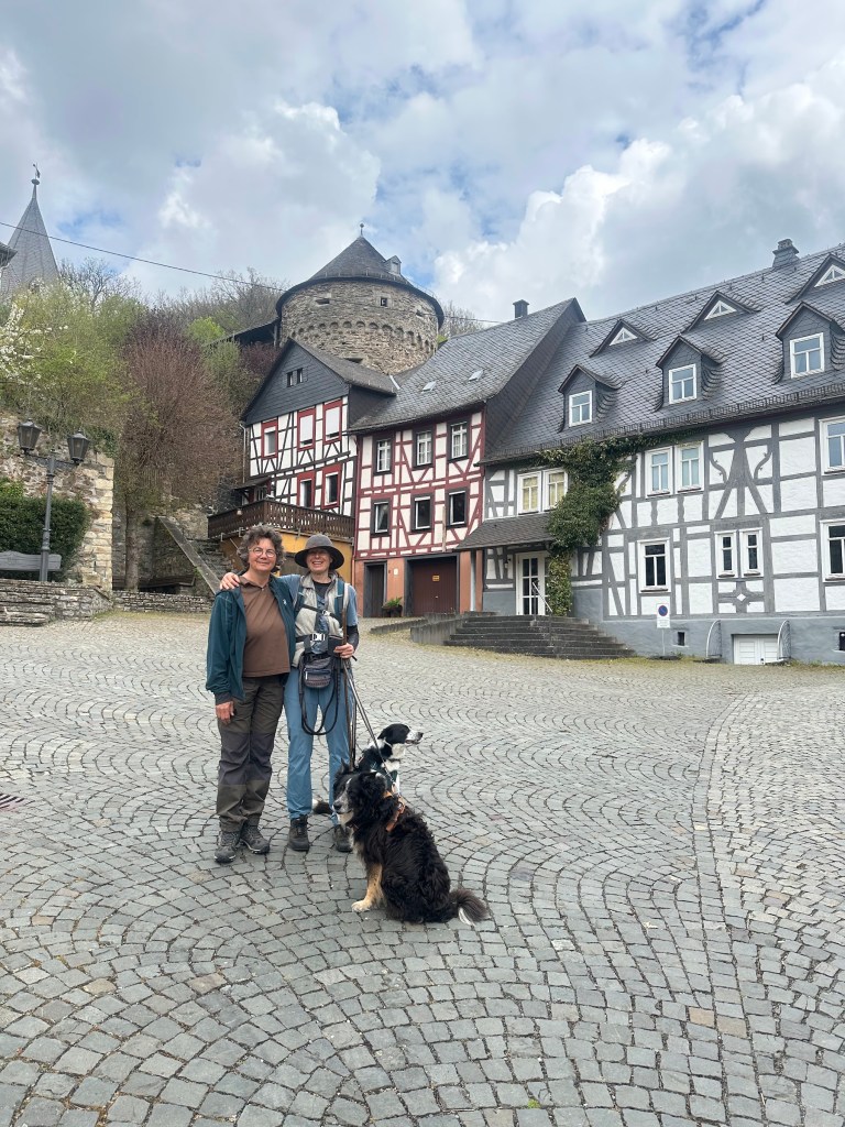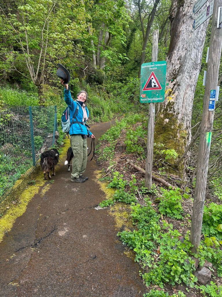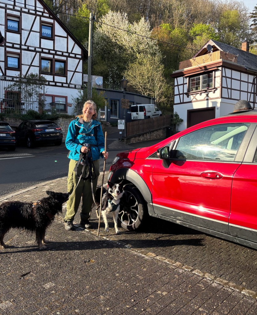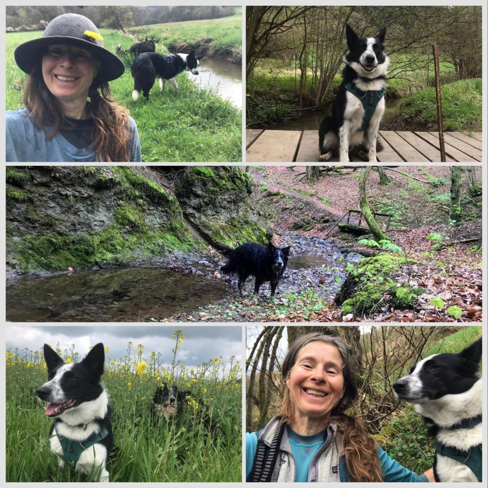 Onze eerste wandelaar is weer van start gegaan om vanuit Bollenbach de vijf etappes van de Hildegard von Bingen Pilgerweg te lopen. Esther, vakleerkracht lichamelijke opvoeding op een basisschool in Den Haag en schaapherder in Delfland, is een super enthousiaste, getrainde loper. Ze geniet intens van het landschap, de stilte, de afwisseling tussen bos en vergezichten en het prachtige voorjaar. En vooral ook van Muddy en Bob, haar twee bordercollies, die het heerlijk vinden: wat een vrijheid en dan al die verrukkelijke nieuwe geuren en beken om in te baden.