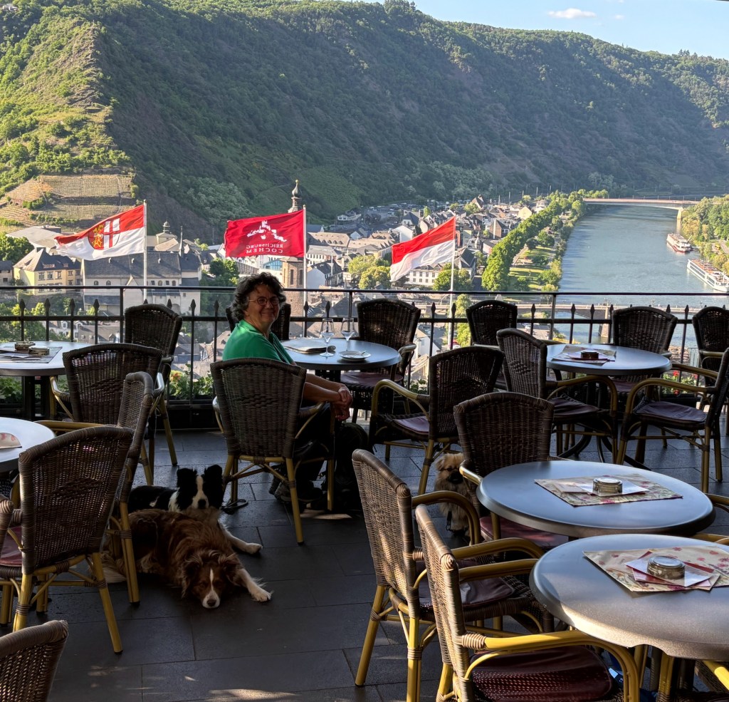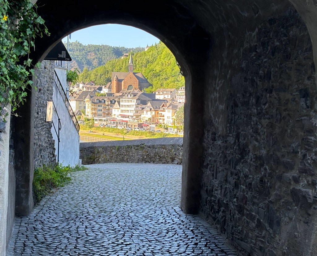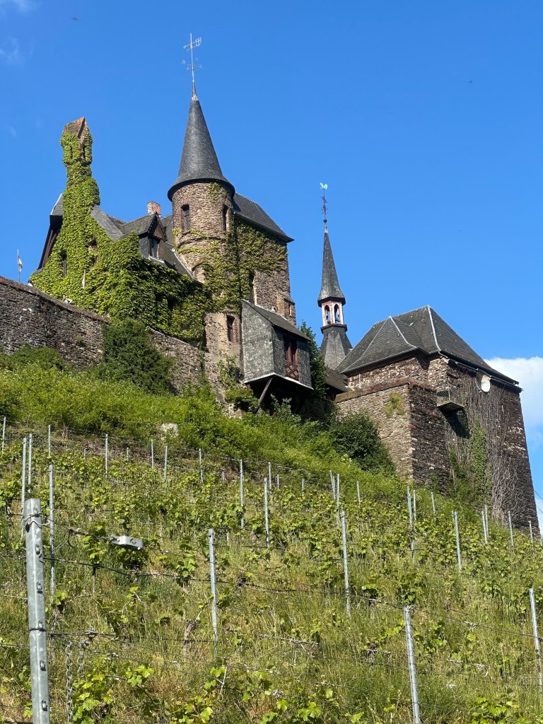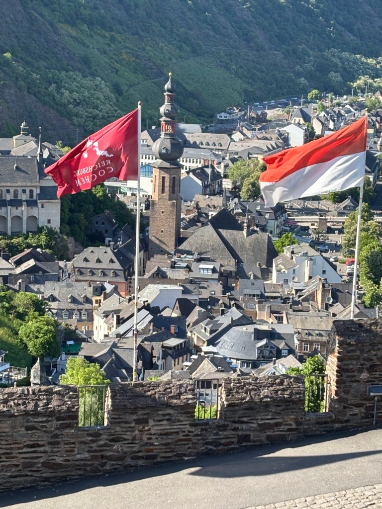 Vanaf het buitenterras van het kasteel van Cochem heb je een schitterend uitzicht over de alom bekende stad aan de Moezel. Je ziet de waggelende massa toeristen zich door de smalle straatje wurmen en voelt je even ver verheven boven alles. Vanaf de burcht kijk je zelfs neer op de kerk, in de middeleeuwen de eerste maatschappelijke stand.