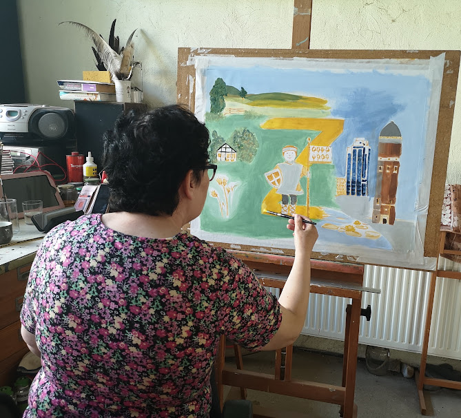 Schilder in de heerlijke tuin met voldoende schaduwplekken of in het koele atelier